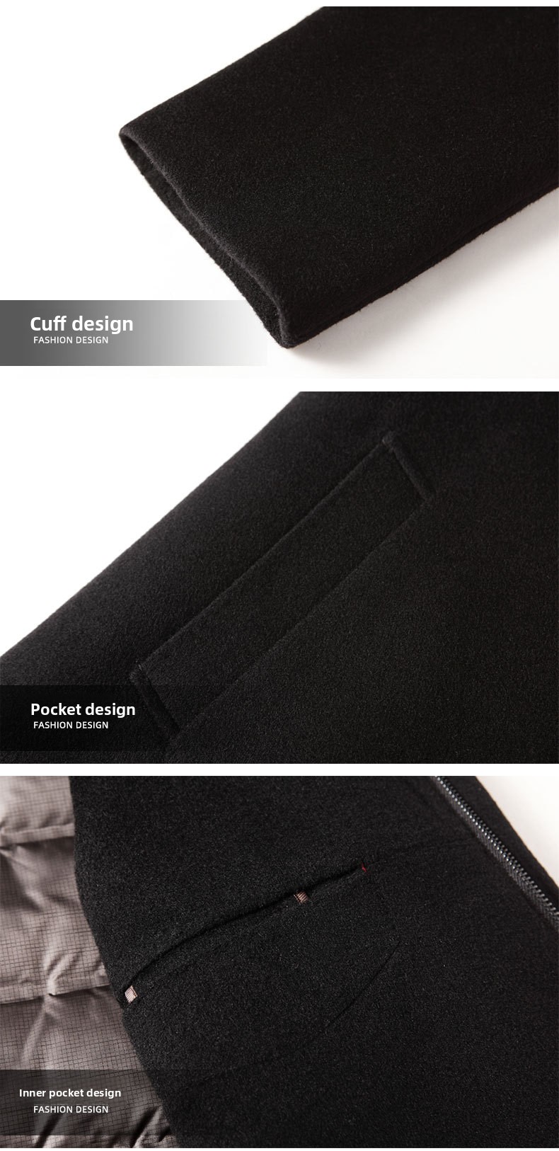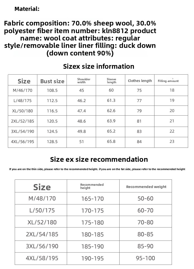 Material: Wool blend (70% wool, 30% polyester), double-sided velvet lining, down inner layer (90% white duck